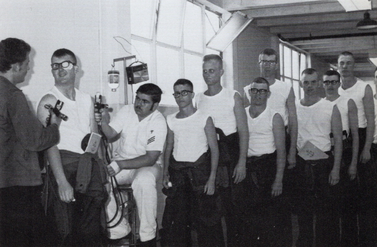 First was uniforms and physicals. And shots. They were delivered by air pressure - one on each arm in assembly line fashion. I do not recall how many I got, but there was no place in the world where i was in danger of catching anything!